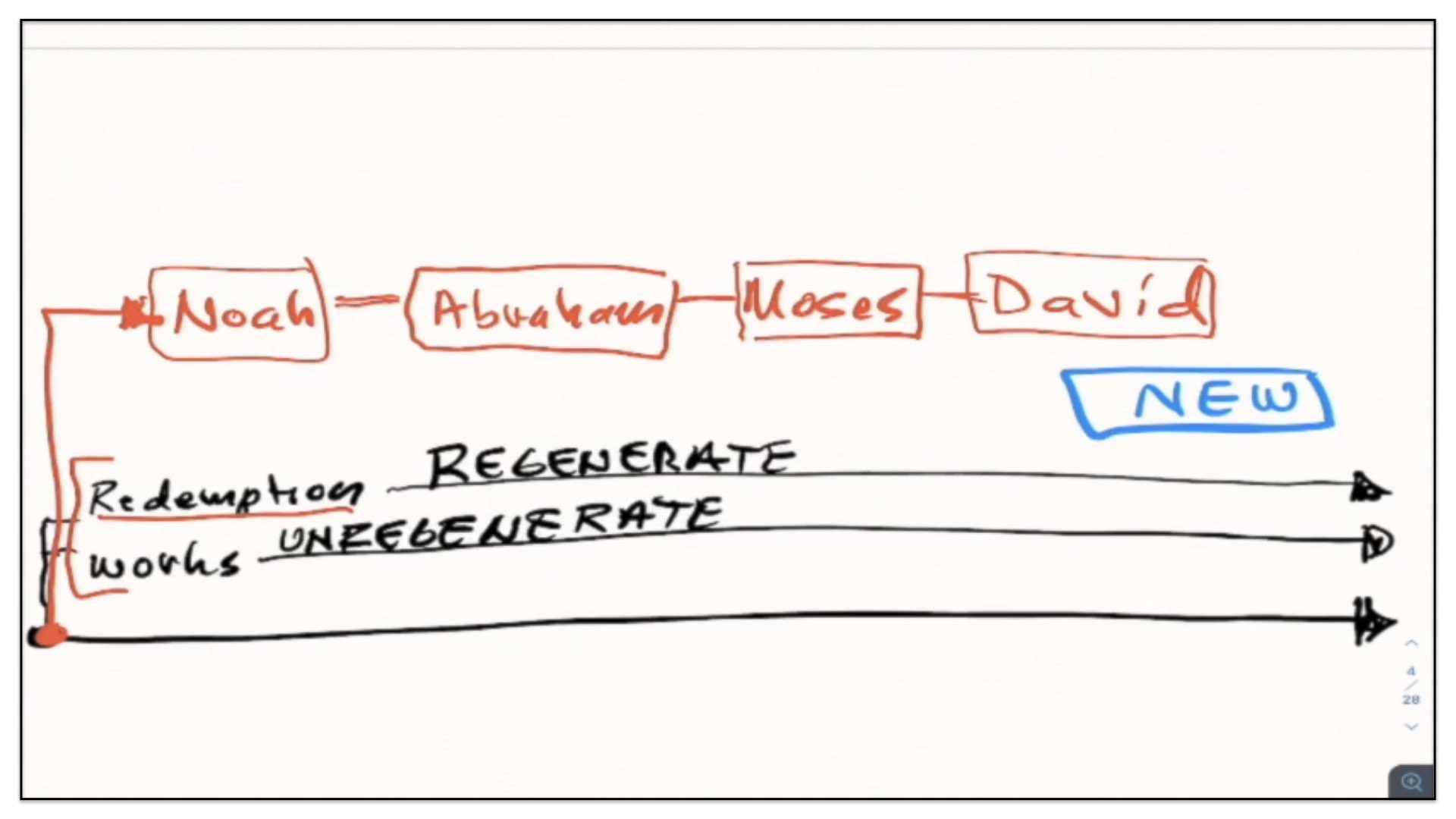 Now, allow me to take this issue and refer you to the diagram and the timeline that I have built for you in the previous weeks. Remember, I have presented to you this basic timeline of history where there are two permanent and spiritual covenants that run through the course of history—that of Redemption and that of Works. Under the Covenant of Works all unregenerate sinners are accountable unto God. And under the Covenant of Redemption all regenerate sinners are accountable to God. And this has been true for Adam and Eve in the garden of Eden, throughout the course of history, to the end of the world. Now apart from these spiritual and perpetual covenants are four earthly and temporary covenants—a covenant God made with Noah, with Abraham, with Moses and with David. And then of course, there’s the New Covenant—the New Covenant which is not an actual covenant, but rather, an explanation of the Covenant of Redemption to the Jewish people as a nation as they were then under the Mosaic economy and subject to its laws.
