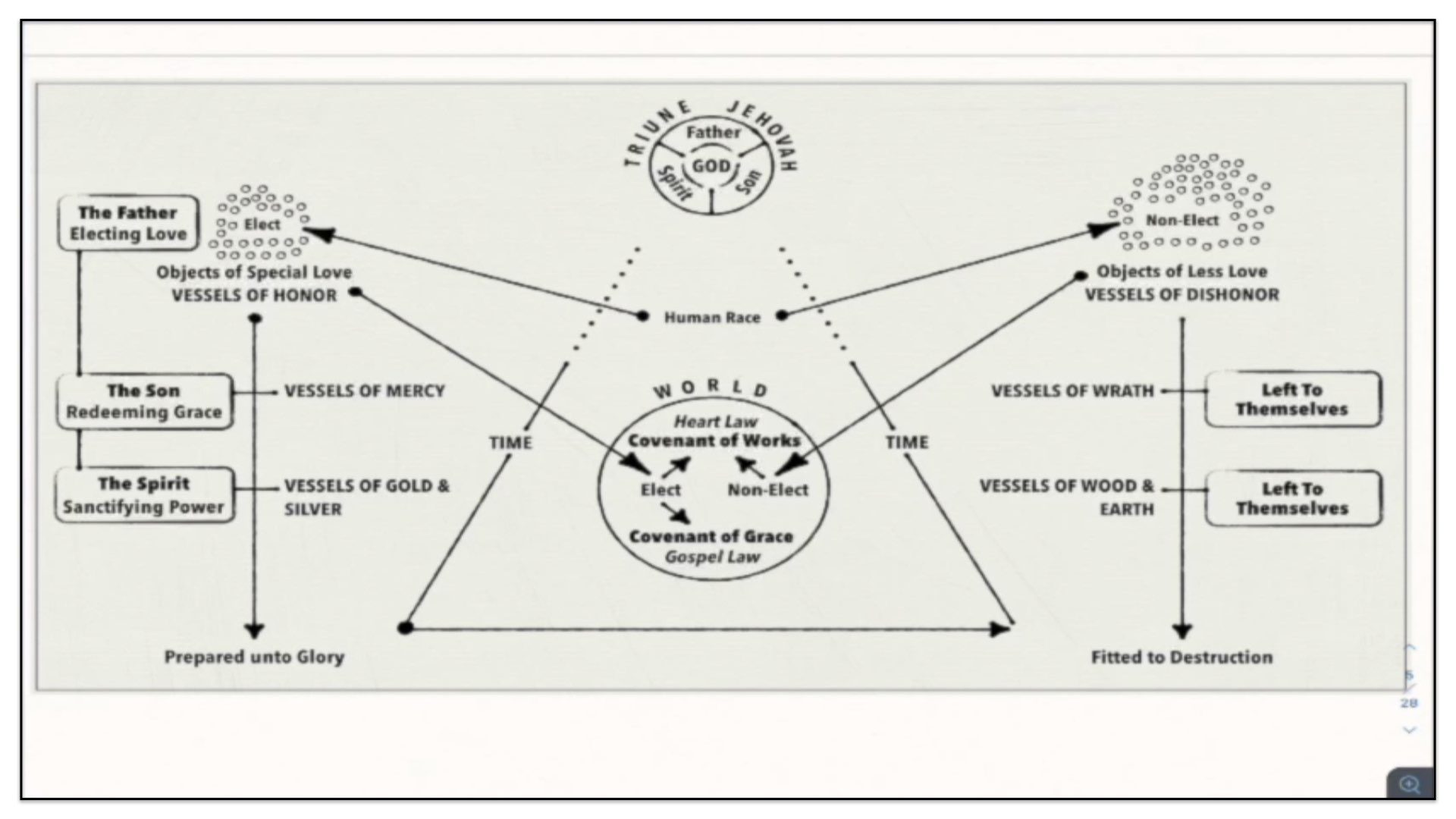 It all begins with the Triune Jehovah who from eternity drew up a blueprint for all that He would do in time and creation. So what we now look at in this diagram is not the actuality of what comes to pass, but rather, the blueprint of what God would bring to pass.