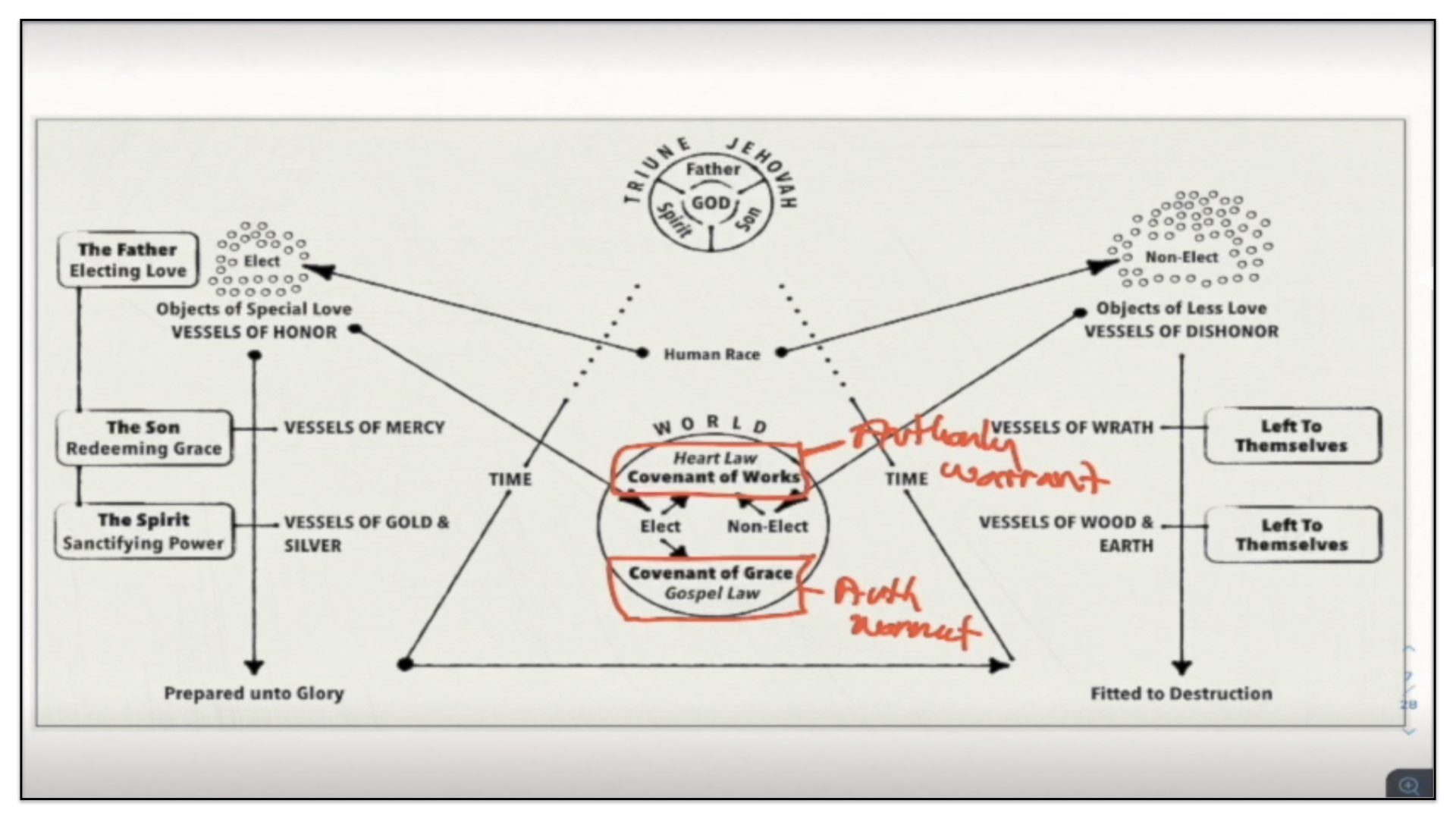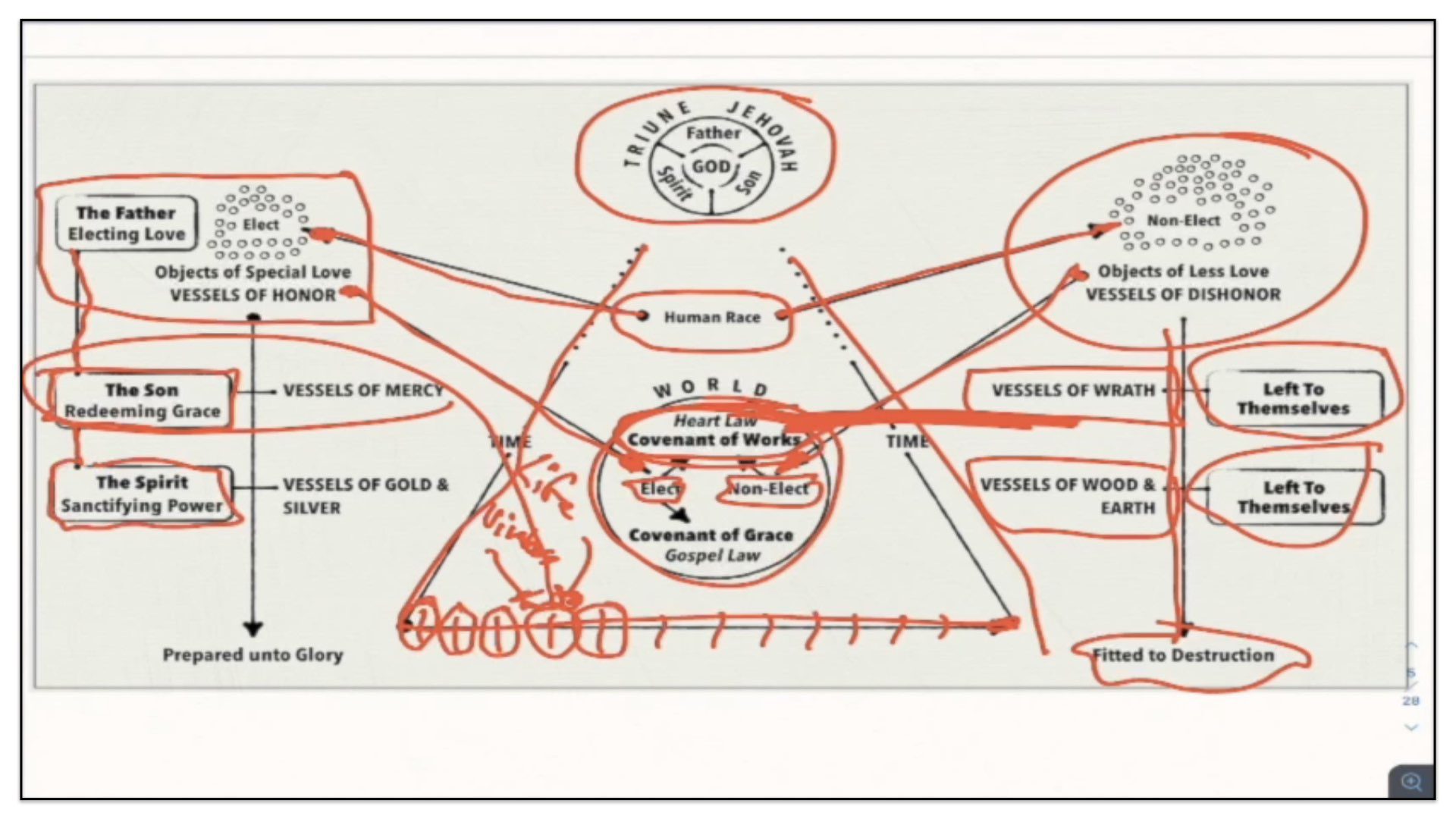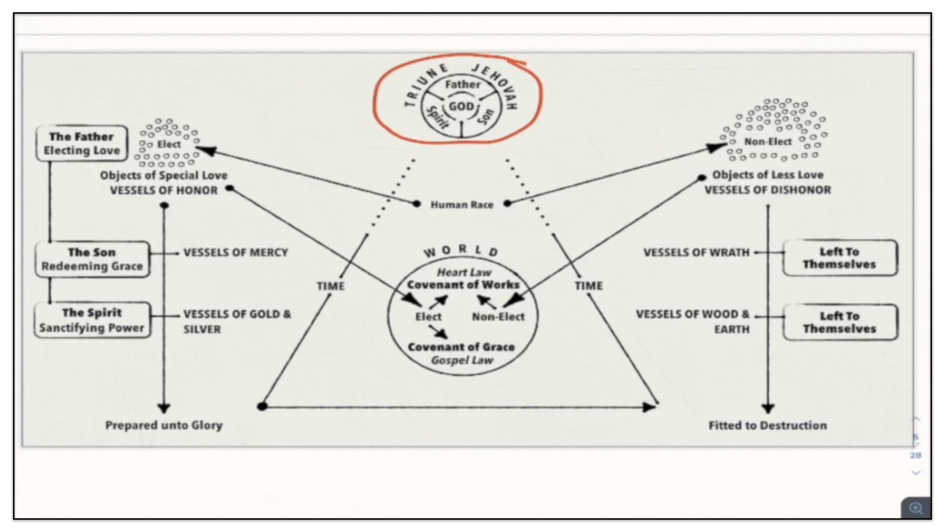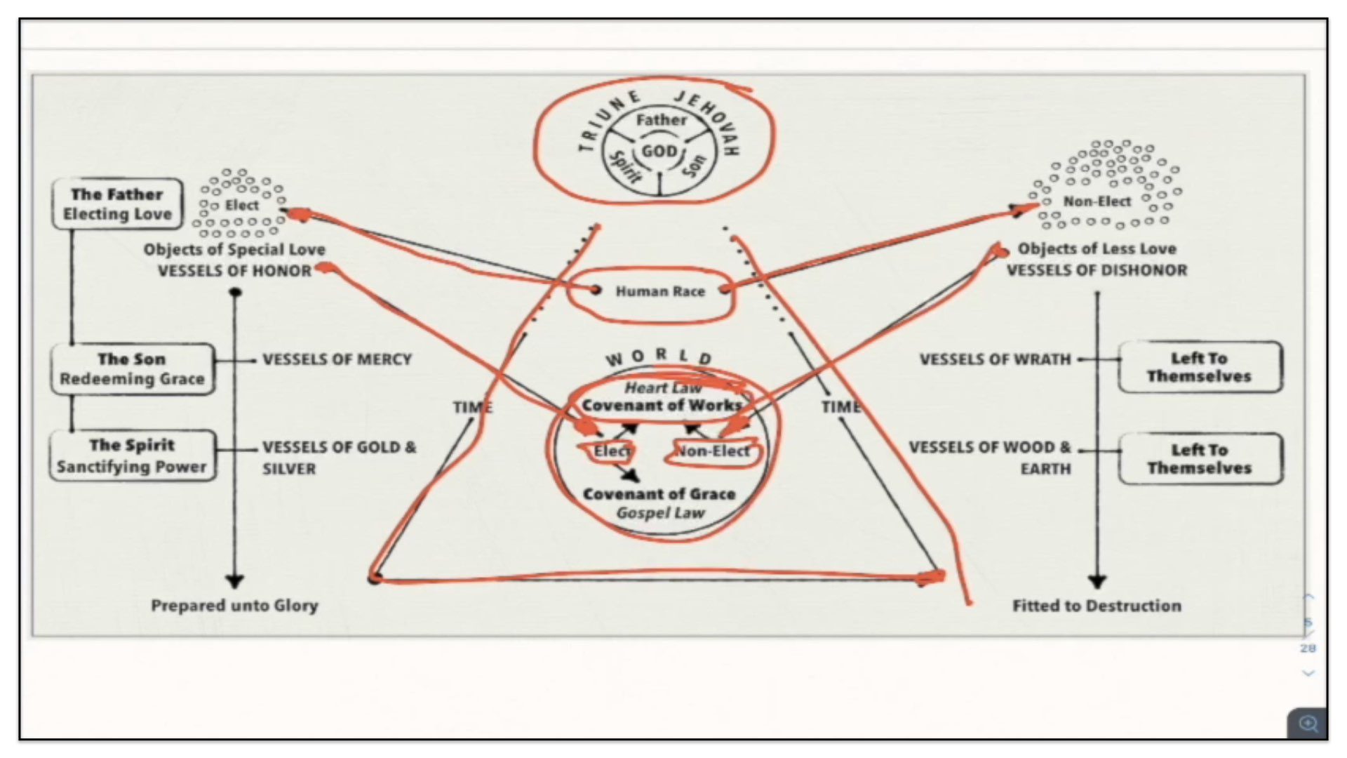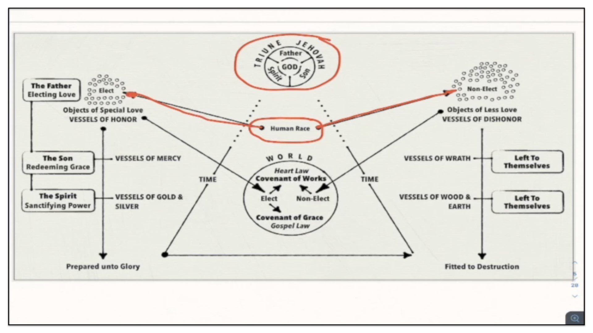 Therefore—and I close now my final thoughts on this teaching—therefore our view is this. This is the basic understanding of the Framework of Sovereign Grace. Because the messy notes above I can’t use those now. I have to just draw this out basic. So watch.