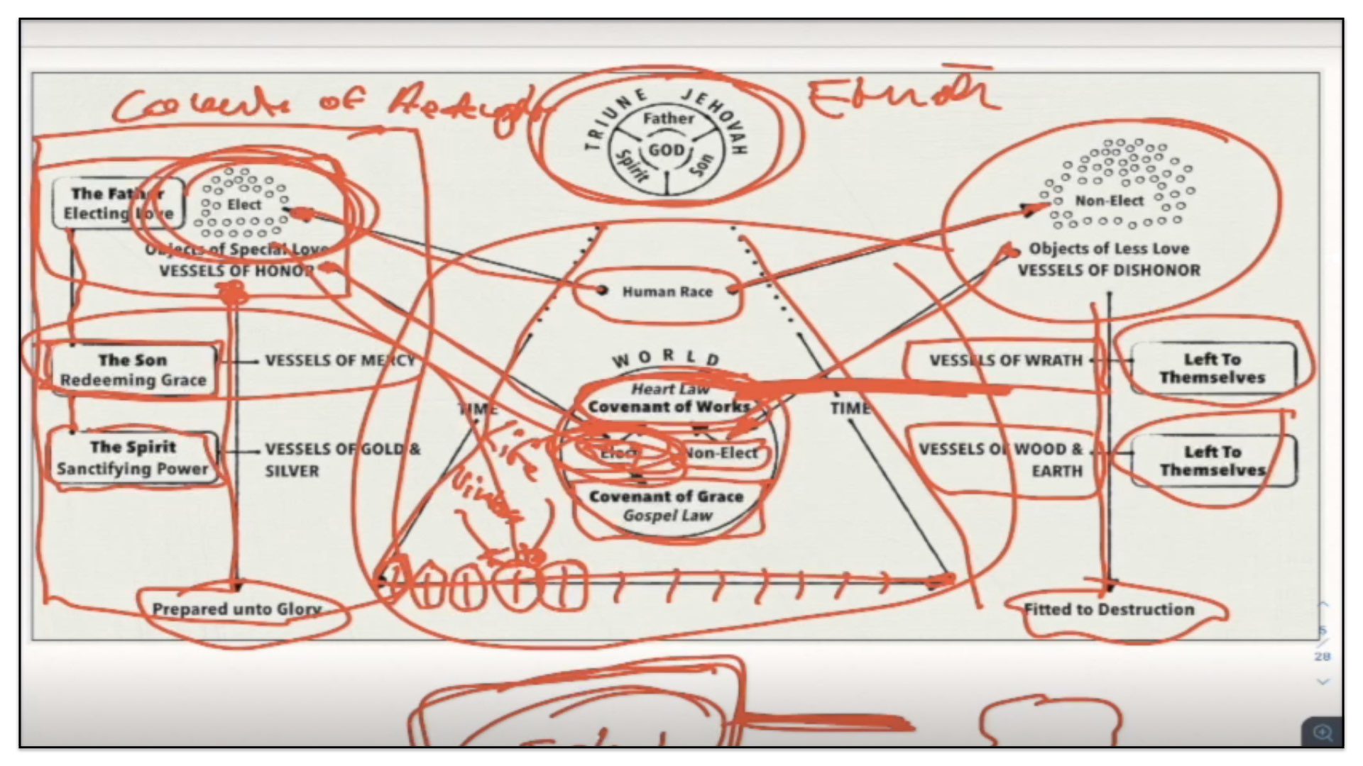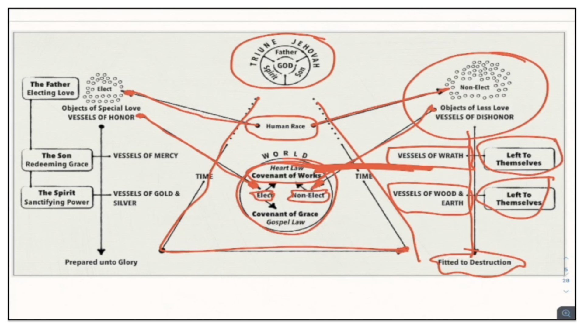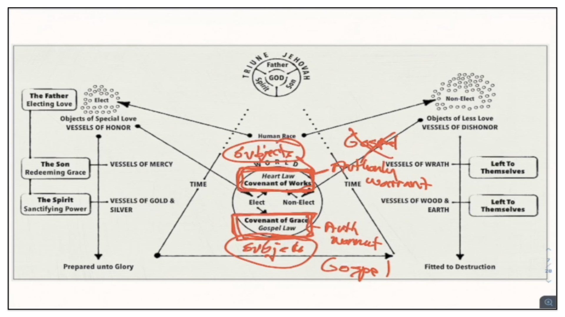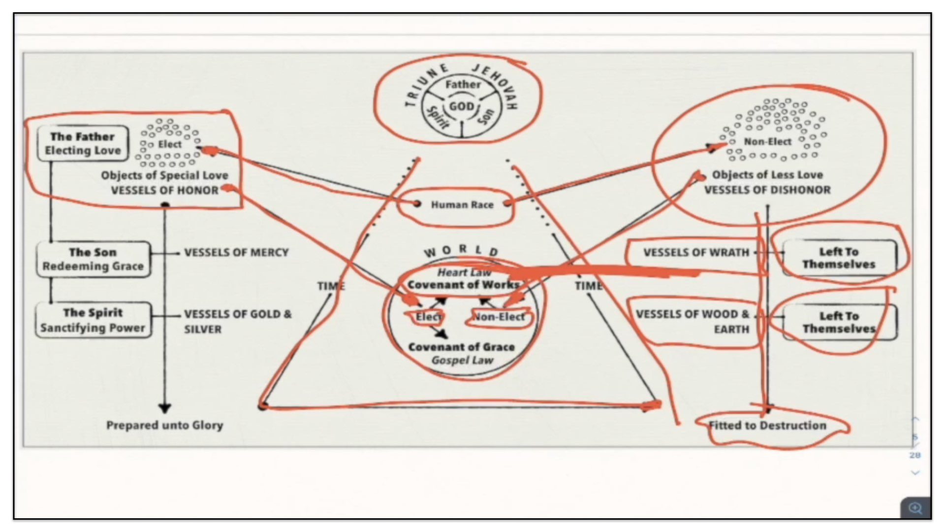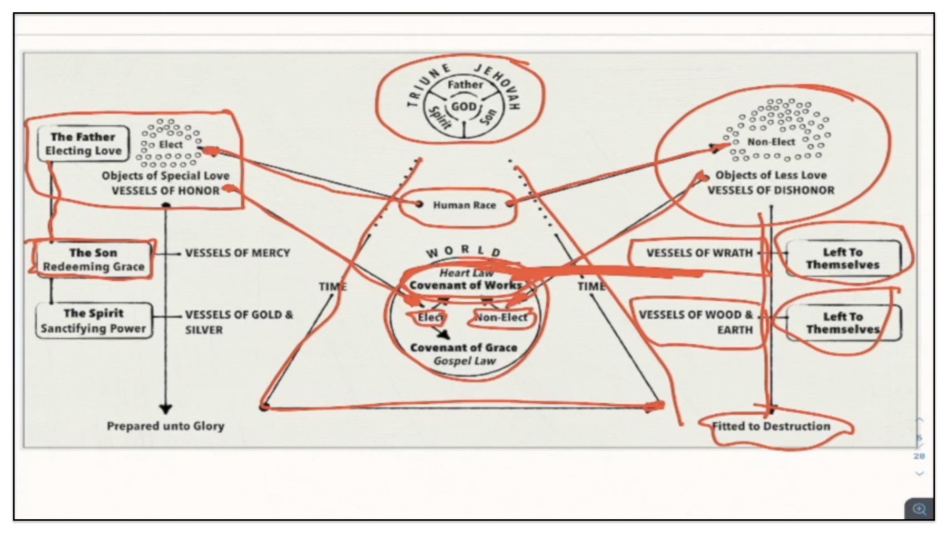 Therefore—and I close now my final thoughts on this teaching—therefore our view is this. This is the basic understanding of the Framework of Sovereign Grace. Because the messy notes above I can’t use those now. I have to just draw this out basic. So watch.