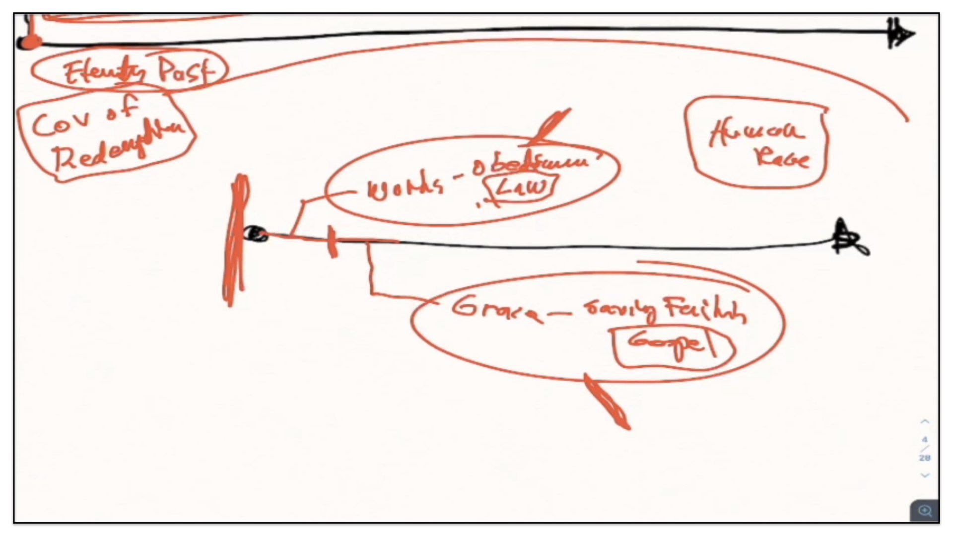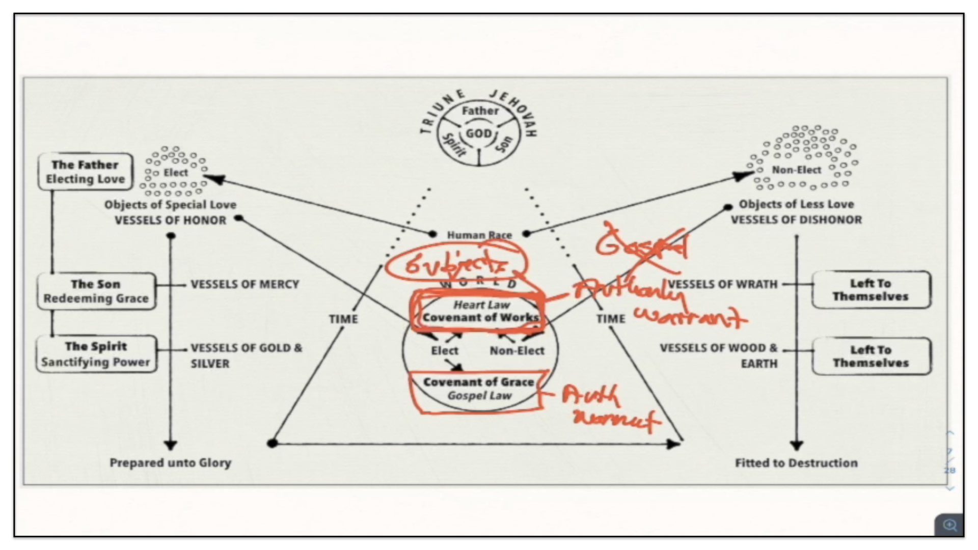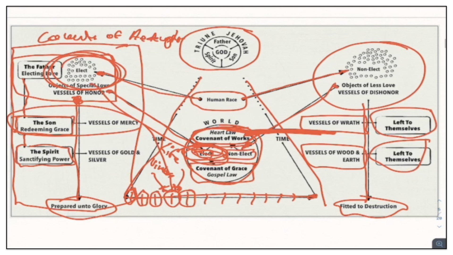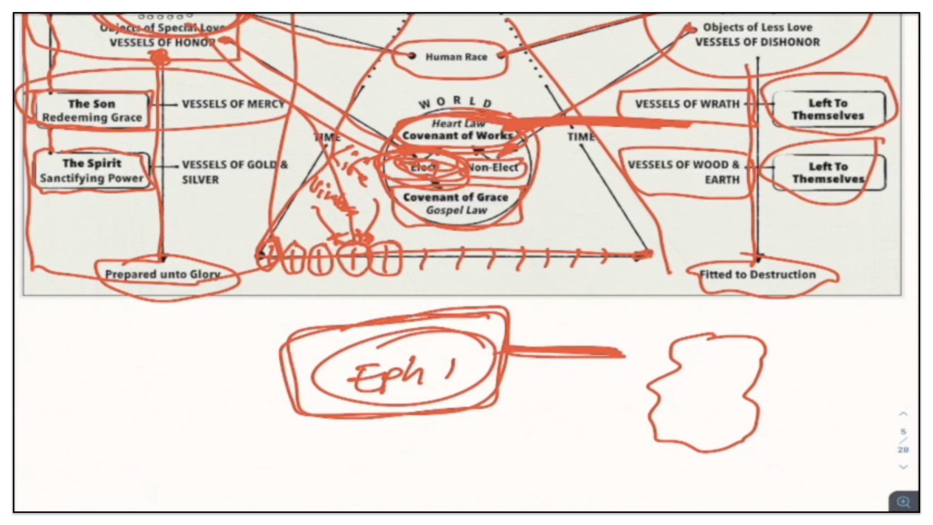 Therefore—and I close now my final thoughts on this teaching—therefore our view is this. This is the basic understanding of the Framework of Sovereign Grace. Because the messy notes above I can’t use those now. I have to just draw this out basic. So watch.