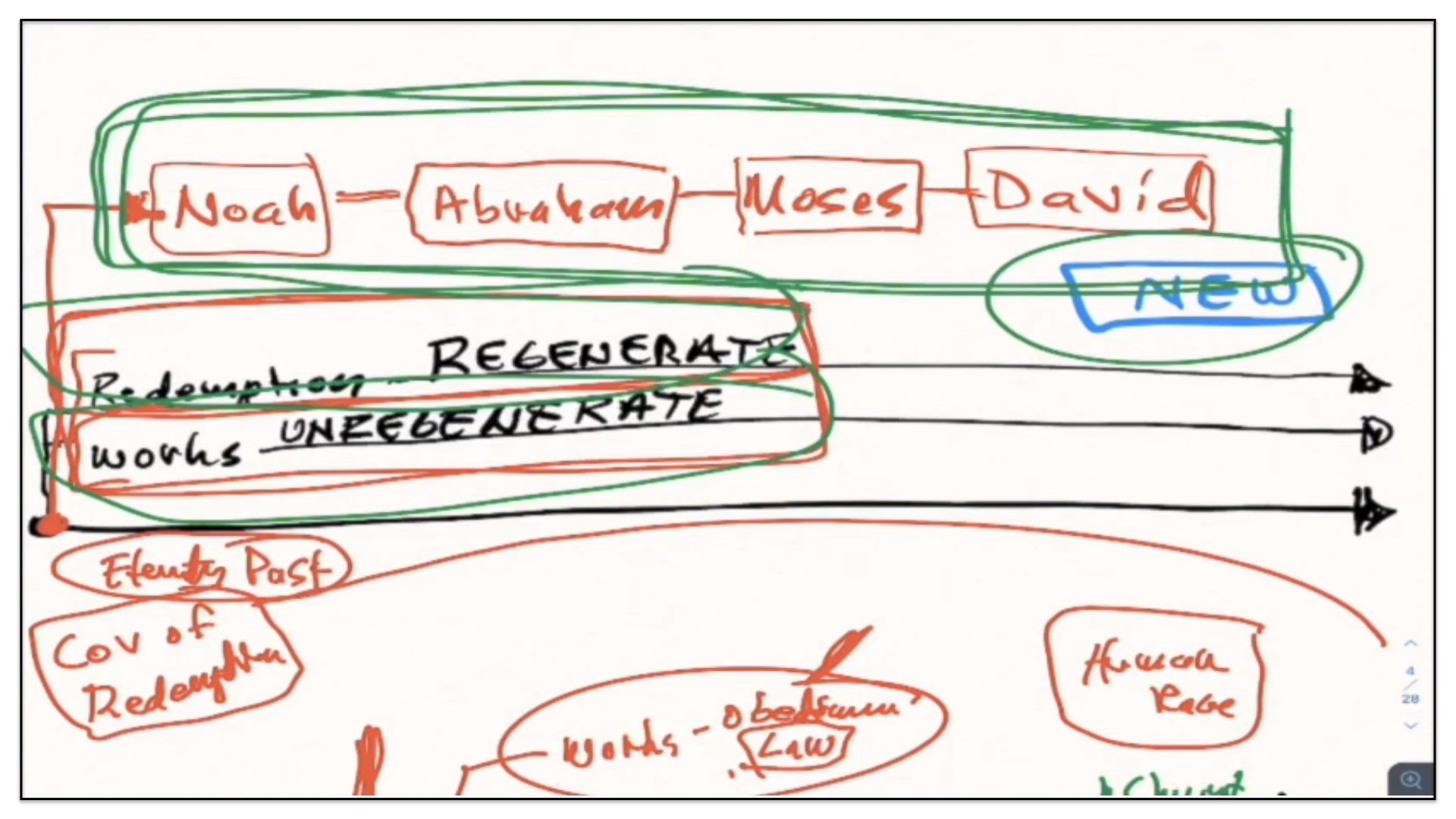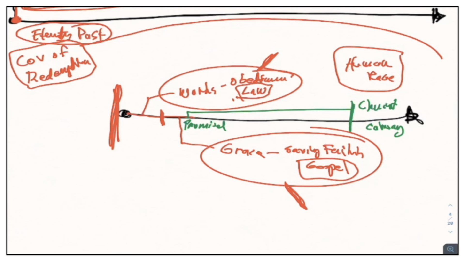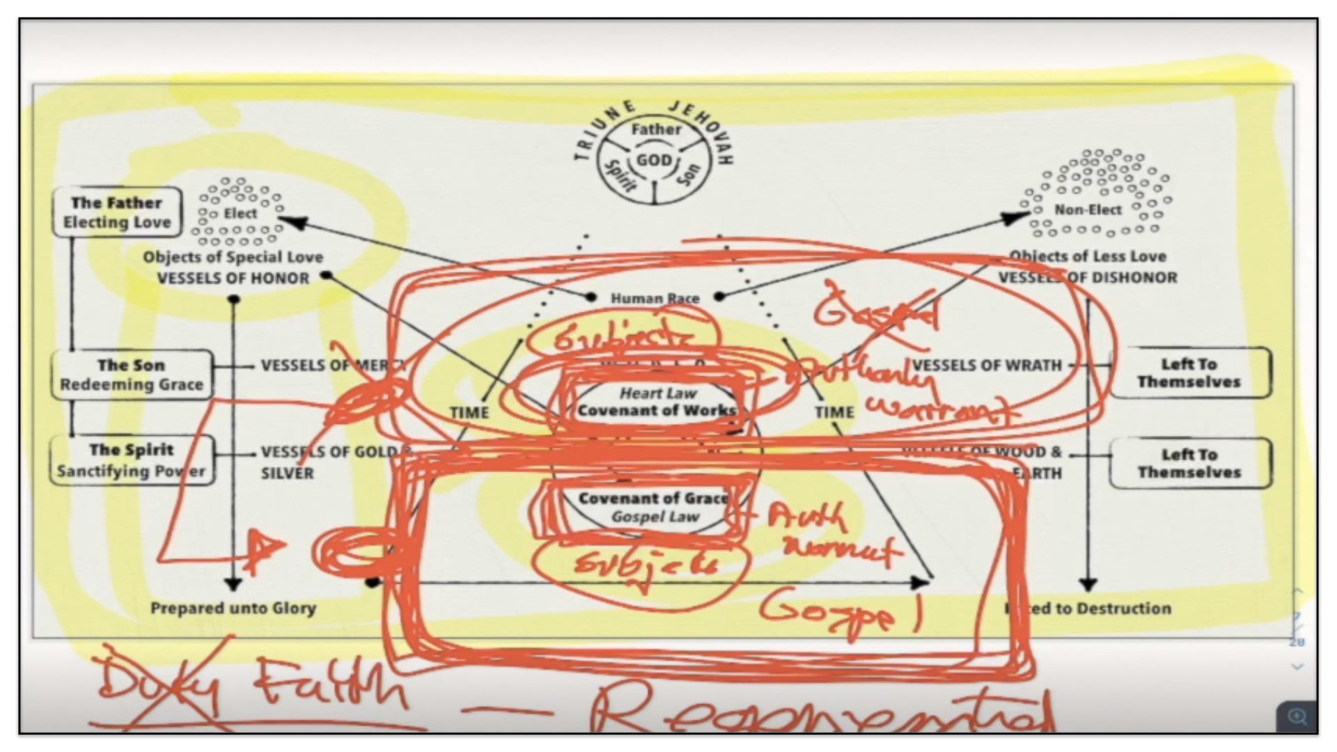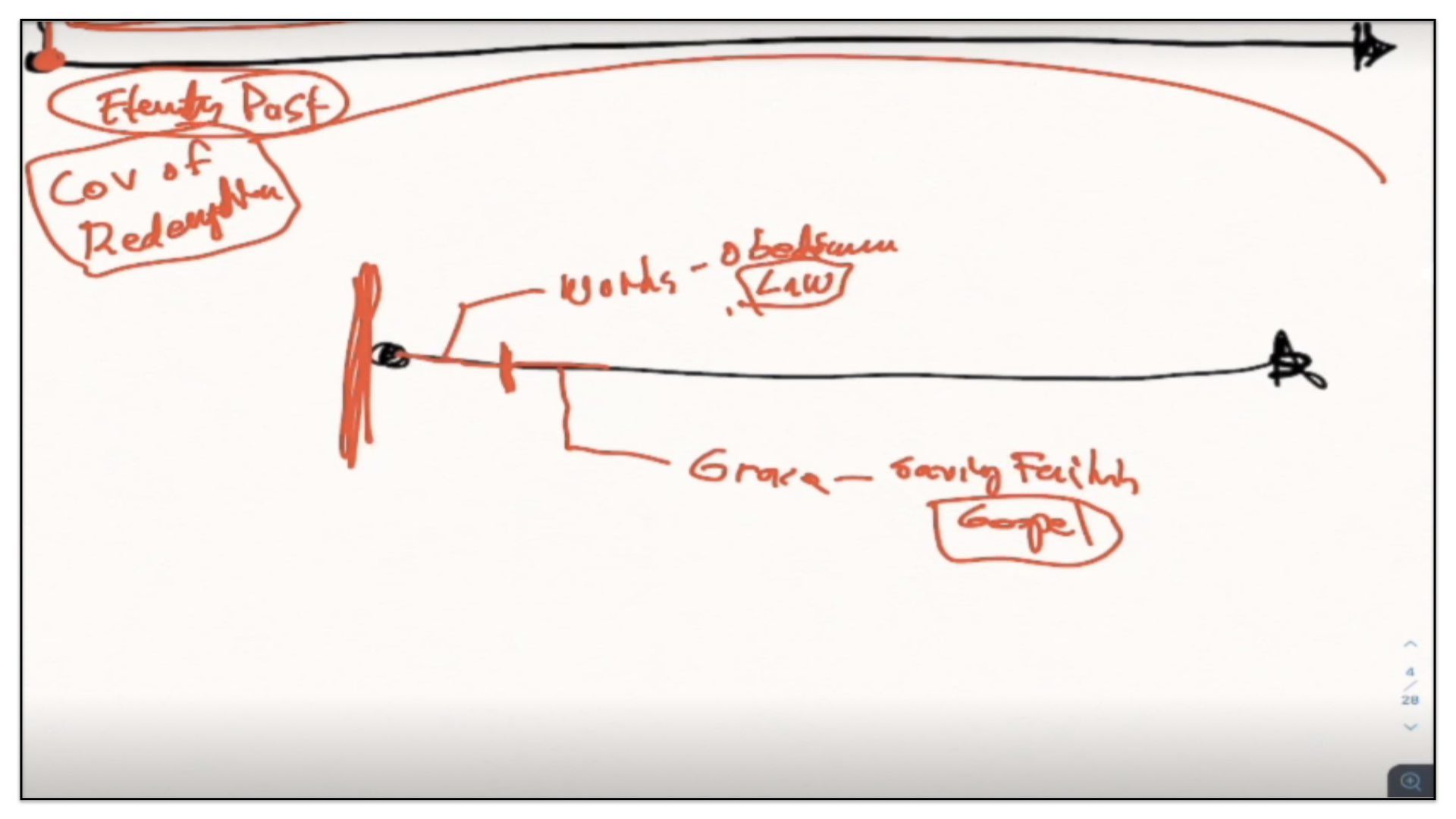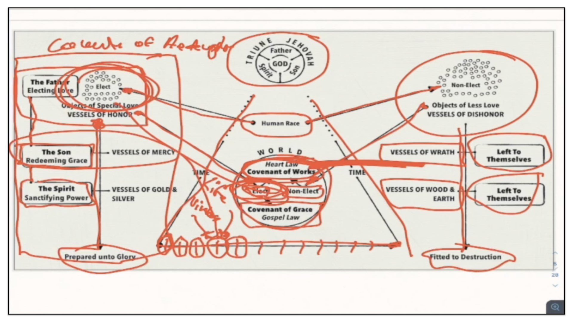 Therefore—and I close now my final thoughts on this teaching—therefore our view is this. This is the basic understanding of the Framework of Sovereign Grace. Because the messy notes above I can’t use those now. I have to just draw this out basic. So watch.