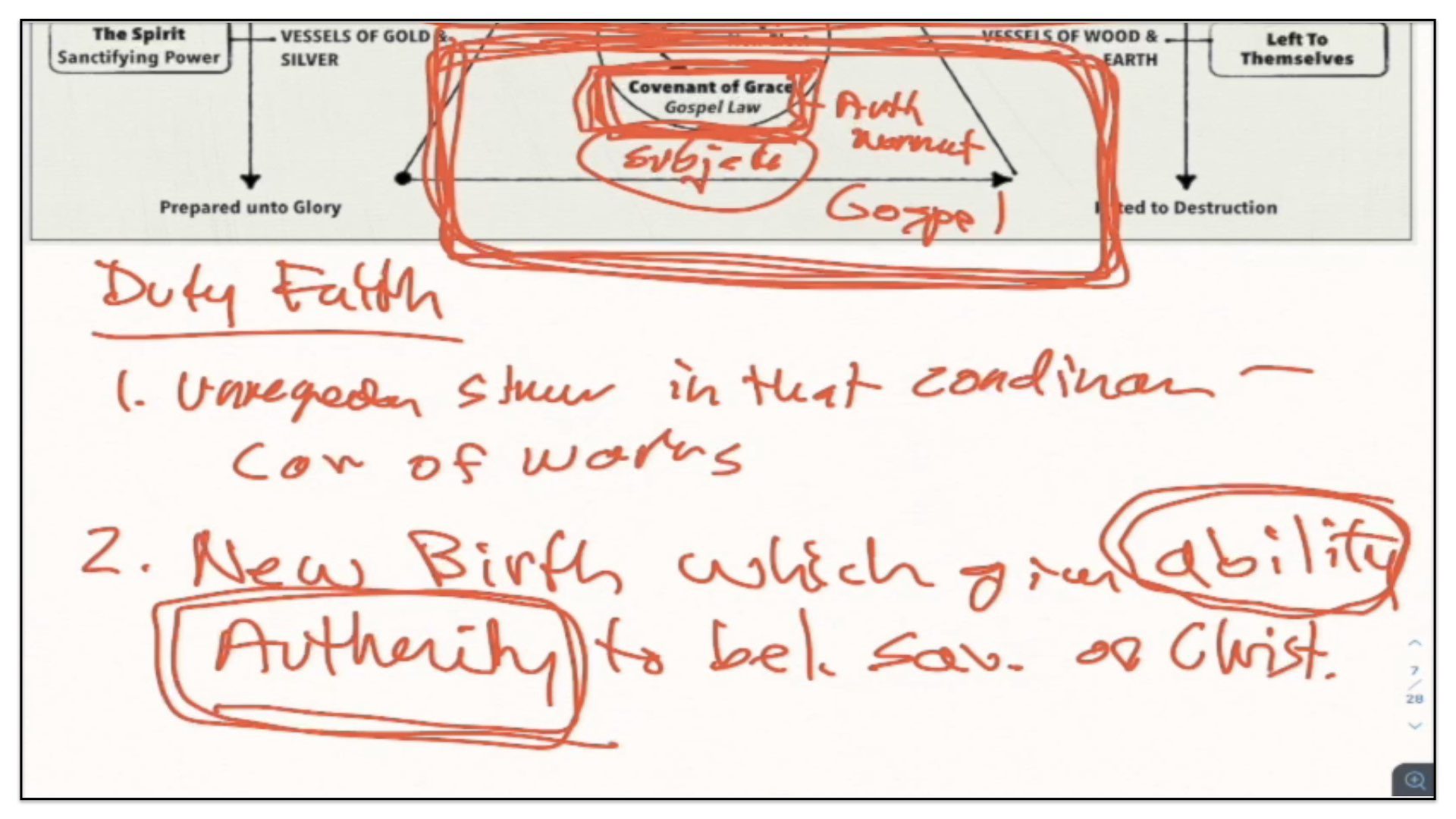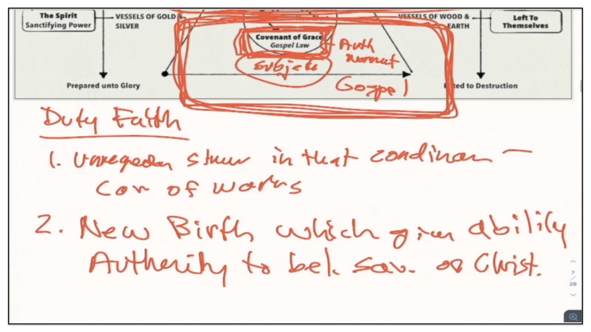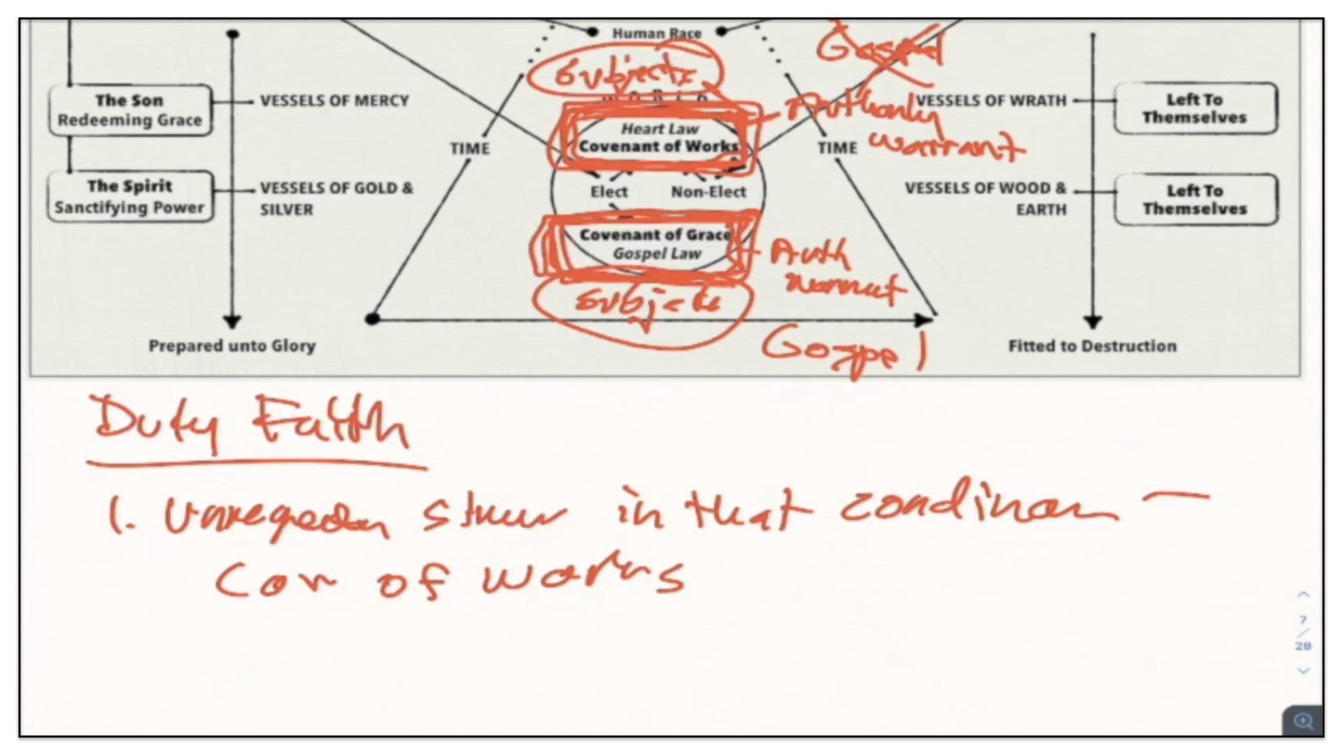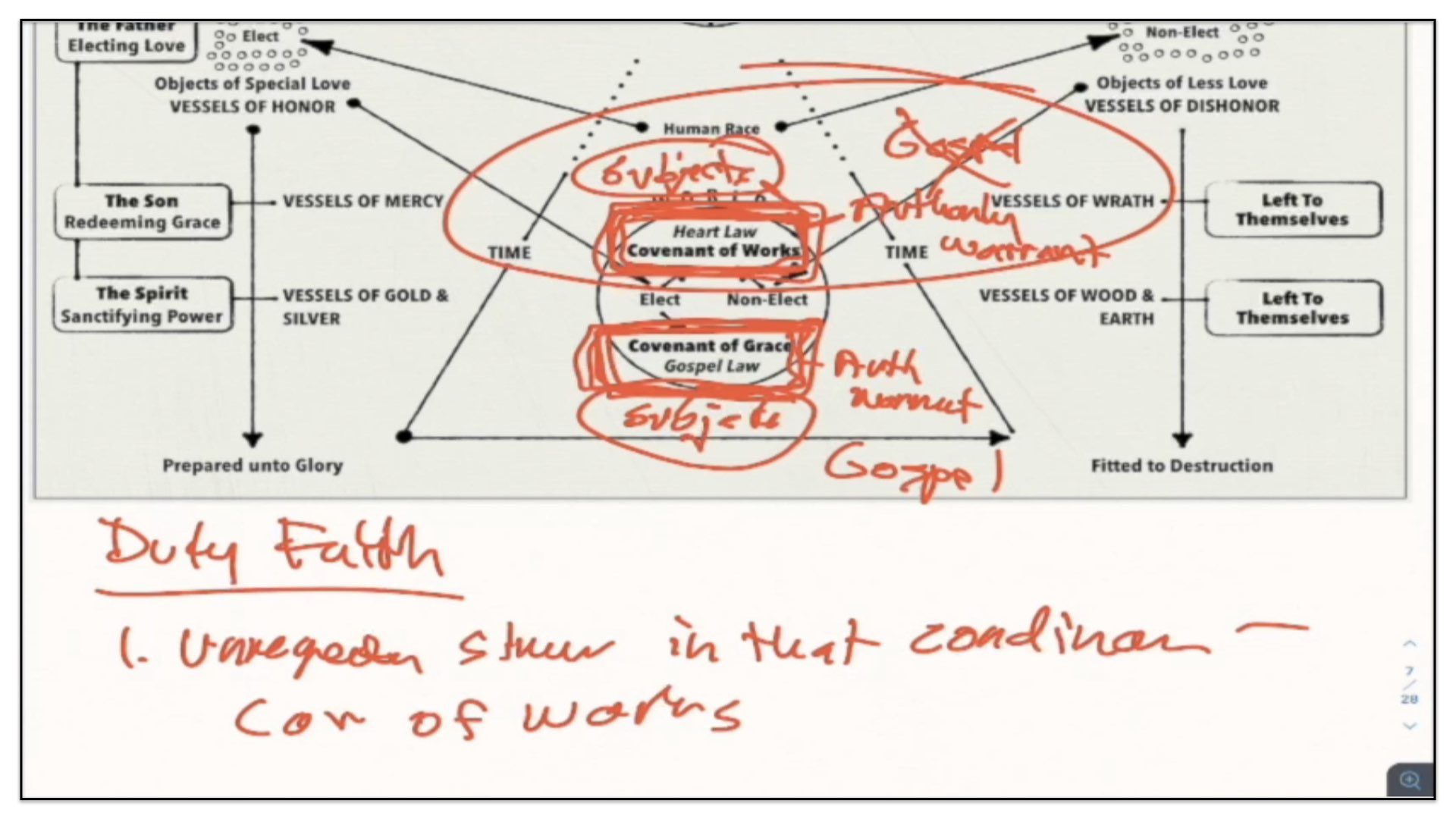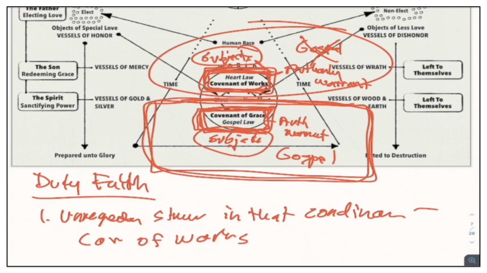 “The first covenant made with man was a covenant of works,” but we just covered those points. You can imagine now where that fits along the timeline and the diagram;“wherein life was promised to Adam; and in him to his posterity, upon condition of perfect and personal obedience.” Okay, so far so good. I agree. “Man, by his fall, having made himself incapable of life by that covenant,” okay, agreed; “the Lord was pleased to make a second, commonly called the covenant of grace;” Ah, now we enter into this conditional Covenant of Grace. What this confessional statement is now discussing is not the Covenant of Redemption between the Father, Son and Spirit, but rather, an agreement that God makes with sinners requiring of them faith in Christ. Watch what follows—“wherein He freely offers unto sinners life and salvation by Jesus Christ,” this of course is called the free offer of the gospel; “requiring of them faith in Him, that they may be saved,” and this of course is what is called the doctrine of duty faith, requiring of them, imposing upon them, faith in Christ that they might be saved; “and promising to give unto all those that are ordained unto eternal life His Holy Spirit, to make them willing, and able to believe.”