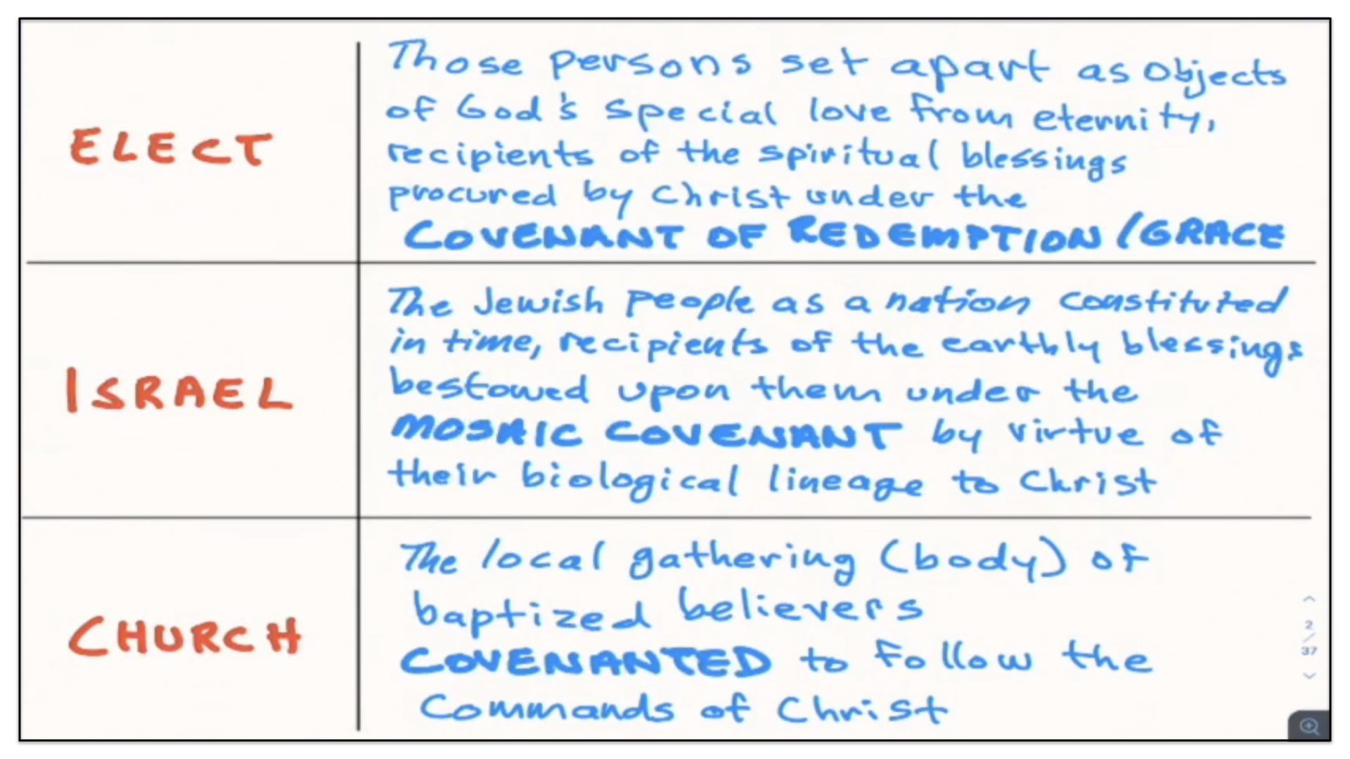 Beginning with the term elect, and of course in the scriptures, this term can be used for a number of different things. But with reference to how we distinguish one group, which are identified as the elect from Israel and the church, this is how I believe should distinguish them. The elect is a reference to those persons set apart as objects of God’s special love from eternity, recipients of the spiritual blessings procured by Christ under the Covenant of Redemption, otherwise known as the Covenant of Grace. This of course refers to all persons throughout the course of history, from Adam and Eve all the way through to the last persons that will be brought into existence. Every one of those persons who have been chosen by the Father and Redeemed by the Son will be regenerated, sanctified by the Holy Spirit. And you see, it’s in this way God has only one spiritually elect people with a single redemptive plan of salvation for them. That’s what I mean when I refer to the elect in this context.