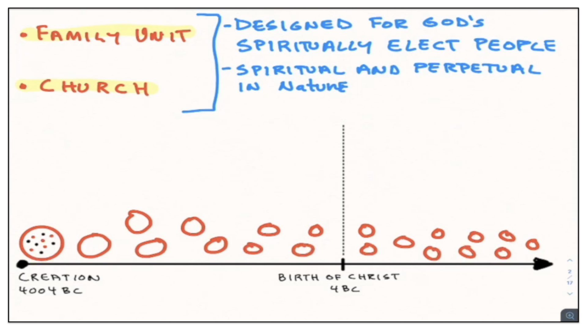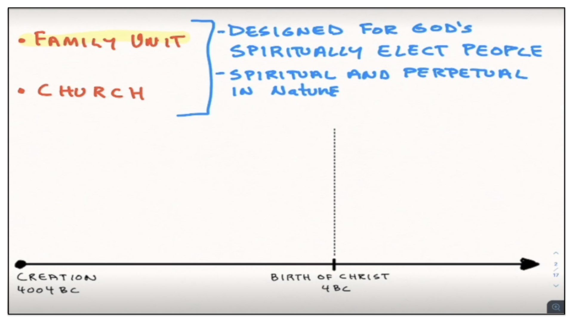 Turning your attention then to those religious institutions, along with the timeline that will help me better explain these matters, I’d like to begin by highlighting for you some things concerning the family unit. The first of these institutions, the family unit, was the original place for God’s spiritually elect people to meet. After they experience the new birth—and they all did, tracing our way all the way from Adam and Eve, all of them experienced the new birth, that they be numbered among God’s spiritually elect—after they experienced the new birth, they would naturally seek to worship God within their own little communities. And this would have been formed naturally by the members of their own family.