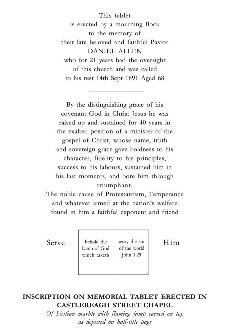 “We grieve to have to report the death, at the age of sixty seven, of our right trusty brother, Pastor Allen, of whom it may well be said that he never feared the face of man. He was one of the few who represented, in these degenerate days, the Old Puritan spirit. He was an indefatigable opponent of the influence and pretensions of Romanism. He will be missed both in the pulpit and in the home, and among the brethren at large.”