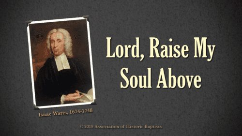 1 Lord, raise my soul above the ground, And draw my thoughts to Thee; Teach me, with sweet and solemn sound, To praise the eternal Three. Long ere the lofty skies were spread, Jehovah filled His throne; Or Adam formed, or angels made, The Maker lived alone. 2 His boundless years can ne’er decrease, But still maintain their prime; Eternity’s His dwelling-place, And ever is His time; While like a tide our minutes flow, The present and the past, He fills His own immortal NOW, And sees our ages waste.